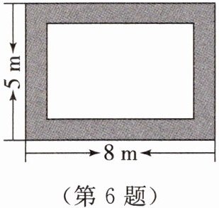 6. 如图是花边(阴影部分)宽度相等的地毯,它的长为8m,宽为5m。如果地毯中央矩形图案的面积为$18m^2,$那么花边的宽为多少米?如果设花边的宽为x m,那么地毯中央矩形图案的长为