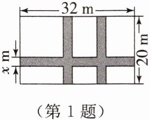 1. 如图,某小区计划在一块长为32m,宽为20m的矩形空地上修建三条同样宽的道路,剩余的空地上种植草坪,使草坪的面积为$570m^2。$若设道路的宽为x m,则下面所列方程正确的是(