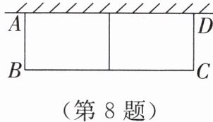 8. 如图,某小区准备用总长为30m的篱笆围成矩形花圃ABCD,花圃一面靠墙(墙足够长),且花圃中间隔有一道垂直于墙的篱笆,当矩形花圃ABCD的面积是$72m^2$时,AB的长为