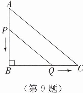 9. 如图,在△ABC中,∠B = 90°,AB = 5cm,BC = 6cm,点P从点A开始沿AB向点B以1cm/s的速度运动,同时点Q从点B开始沿BC向点C以2cm/s的速度运动,当点Q运动到点C时,两点都停止运动。经过多长时间,△PBQ的面积是$4cm^2?$