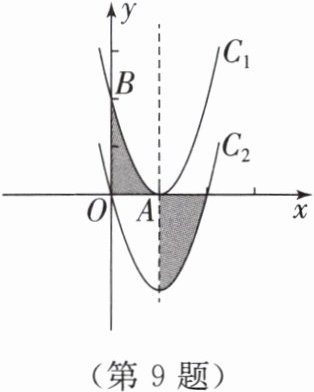 9. 如图,抛物线 $ C_{1}: y = ax^{2} + bx + c $ 与 $ x $ 轴只有一个公共点 $ A(1,0) $,与 $ y $ 轴交于点 $ B(0,2) $,虚线为其对称轴,若将抛物线向下平移 2 个单位长度得到抛物线 $ C_{2} $,求图中两个阴影部分的面积和.