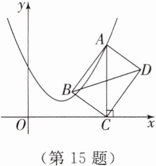 15. 如图,在平面直角坐标系中,点 $ A $ 在抛物线 $ y = \frac{1}{2}x^2 - 2x + 3 $ 上运动,过点 $ A $ 作 $ AC \perp x $ 轴于点 $ C $,以 $ AC $ 为对角线作矩形 $ ABCD $,连接 $ BD $,则对角线 $ BD $ 的最小值为