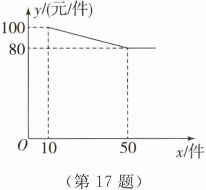 17. 服装厂批发某种服装,每件的成本为 65 元,规定不低于 10 件可以批发,其批发价 $ y $(元/件)与批发数量 $ x $(件)($ x $ 为正整数)之间所满足的函数关系如图所示.