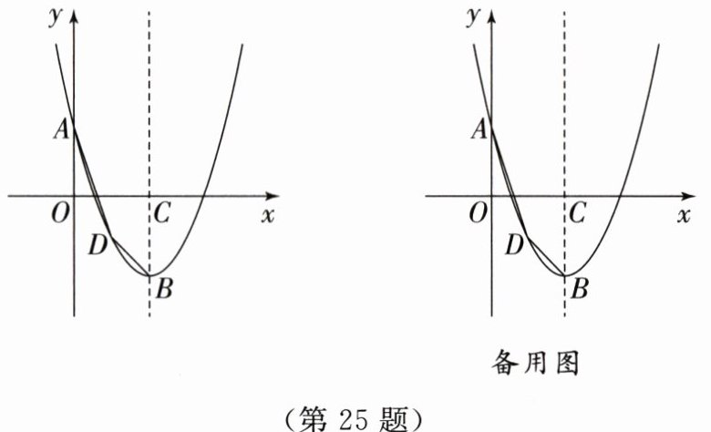 (2)由题意,得C(2,0).因为y=x²-4x+2=(x-2)²-2,所以B(2,-2),所以BC=2,OC=2.连接OB(图略),则∠OBC=∠BOC=45°.因为∠DBC=45°,所以点D是直线OB与抛物线的交点.设直线OB的解析式为y=kx.把B(2,-2)代入,得k=-1,所以y=-x.联立{y=-x,y=x²-4x+2,解得{x=2,y=-2(舍去)或{x=1,y=-1,所以点D的坐标为(1,-1).
