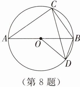 8. 如图,$ AB $ 是 $ \odot O $ 的直径,$ C $,$ D $ 是圆上两点。若 $ DC $ 平分 $ \angle ODB $,$ \angle BCD = 20^{\circ} $,则 $ \angle CAB $ 的度数为(
