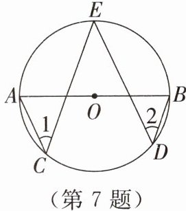 7. 如图,$ AB $ 是 $ \odot O $ 的直径,$ C $,$ D $,$ E $ 都是 $ \odot O $ 上的点,则 $ \angle 1 + \angle 2 = $