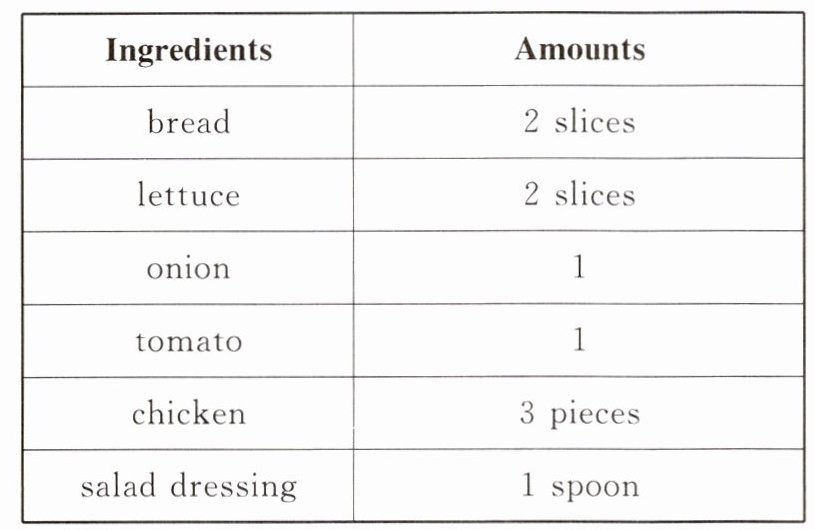 你喜欢吃三明治吗?你知道如何制作三明治吗?请根据下面的食谱,亲手为自己做一份三明治吧。