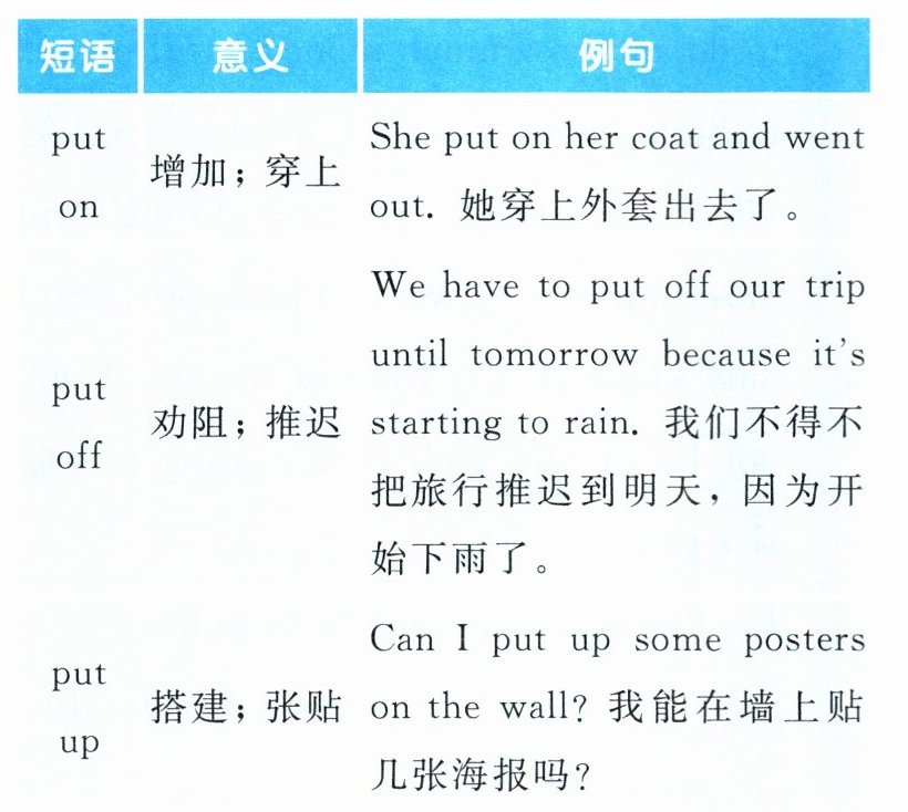 put out意为“扑灭,熄灭;把……摆好”。例如:
