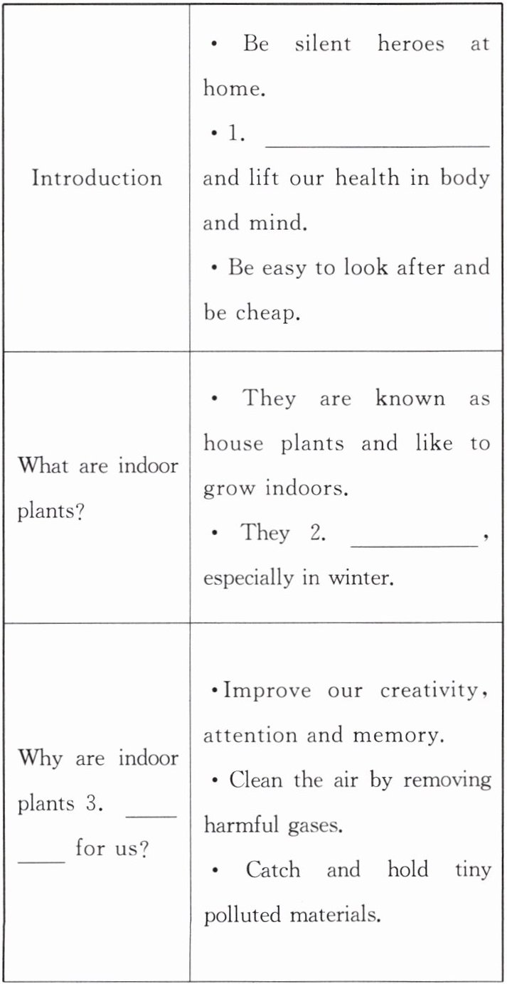 There are many advantages about growing plants indoors. Plants around houses can improve our feelings. Studies have supported this and found that indoor plants can improve our creativity and memory. There is also research showing that houseplants can clean the air around them by removing some harmful gases, such as HCHO (甲醛). Dr Tijana Blanusa said, “Plants catch and hold tiny polluted materials. They remove some harmful chemicals from cooking or painting. Peace lilies and devil’s ivy are the best.”