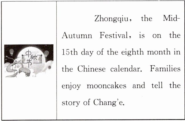 )1. The Mid-Autumn Festival is ______ in the Chinese calendar.A. on August 15th B. on July 7th C. on January 15th