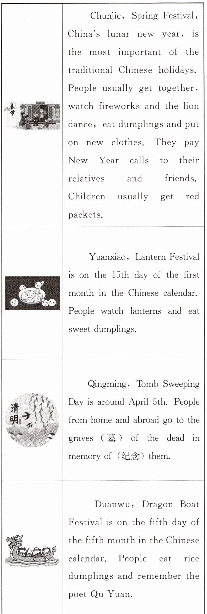 )4. We can know that ______ from the passage.A. people in China eat dumplings in all the traditional festivals B. the Spring Festival is the most important traditional holiday in China C. the Dragon Boat Festival is on the first day of the fifth month