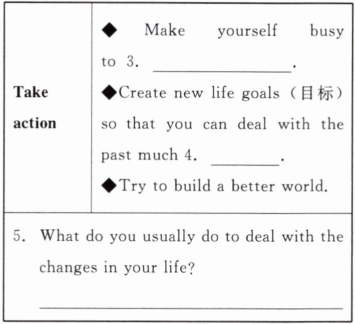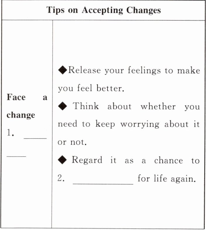 Of course, you need to do something so that you can completely accept changes. When the change influences you, you can keep working, trying something you've never done before, or staying with others. In this way, you'll make yourself forget worries. Finding a way to move on and thinking about your future can help you accept changes. You can get a new job or have a long trip. By looking forward to the future, you'll be able to better deal with the past and accept it as something that had to happen to you to make you move forward. Besides, make a decision to try to use your power(力量)to make an even better world. In this way, you're accepting the change and also turning it upside down.
