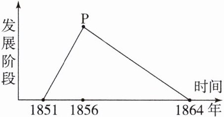 D 【解析】根据题干中的图示信息并结合所学知识可知,P点位于太平天国由盛转衰的转折点,指的是天京事变,D项正确;1851年金田起义是太平天国运动兴起时期,排除A项;永安建制是指太平天国于1851年9月初步建立起政权组织,排除B项;太平军于1853年占领南京,改为天京,定为都城,排除B项。
