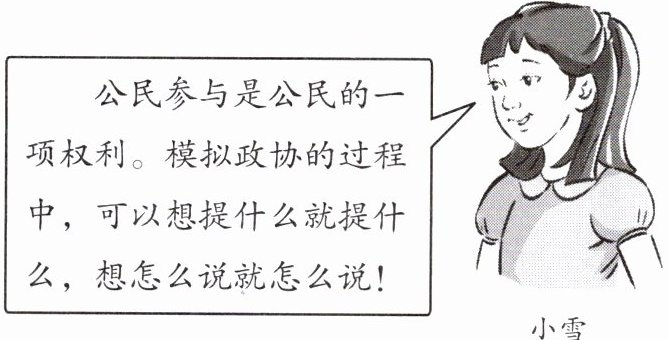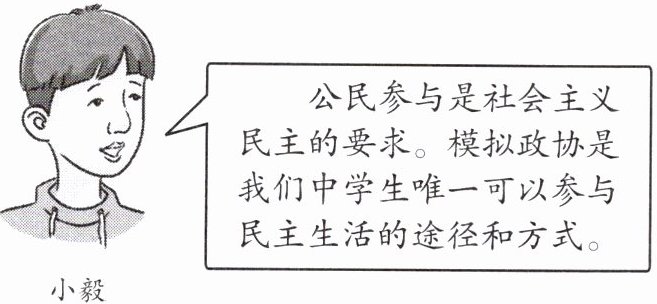 (2)选择小毅:①小毅的观点不完全正确。②公民参与是社会主义民主的要求,也是公民的一项权利。但是,模拟政协不是中学生参与民主生活的唯一途径和方式。③中学生依照法律法规,可以通过民主选举、民主协商、民主决策、民主管理、民主监督等多种途径,以模拟政协、模拟人大、监督听证会、网上评议政府等不同形式参与管理国家和社会事务,实现民主权利,维护自身的合法权利。选择小雪:①小雪的观点不完全正确。②公民参与是公民的一项权利,但认为民主参与就是想提什么就提什么、想怎么说就怎么说的观点是错误的。③我们在参与民主生活过程中应依照法律法规,从实际出发,提出合理合法的意见建议,以理性、公正、客观的态度全面、深刻、辩证地看问题,立场正确、逻辑清晰地表达观点和意见,逐步提高依法有序参与民主生活的能力。