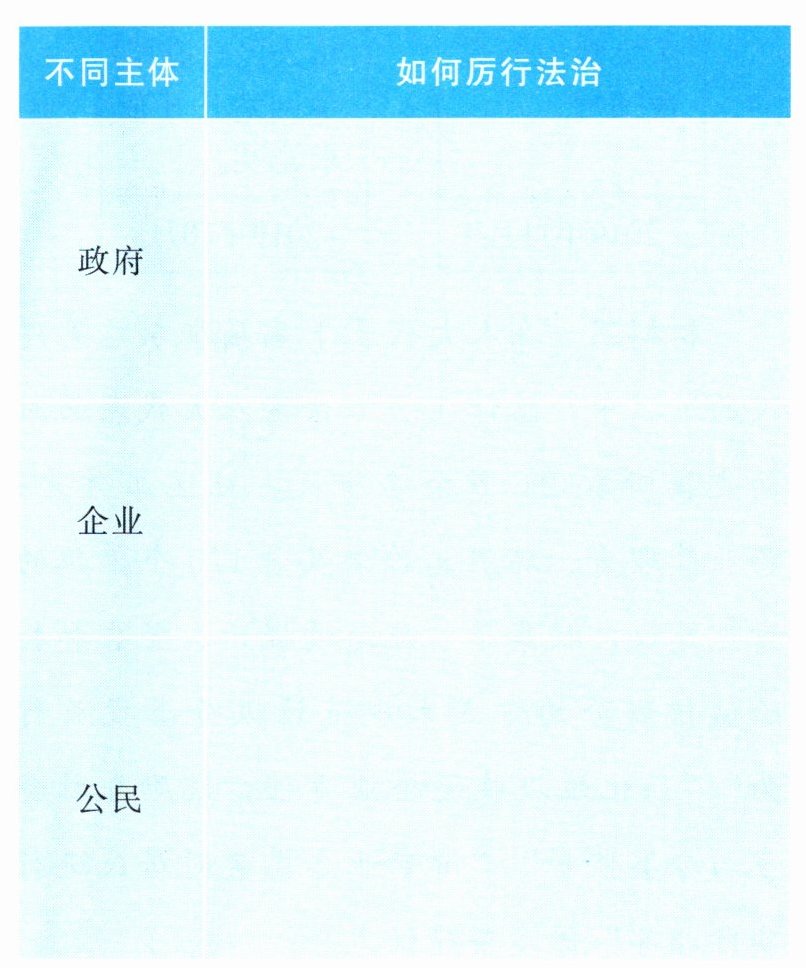 23. 厉行法治是对全体社会成员的共同要求,请结合所学知识,写出不同主体厉行法治的做法。
