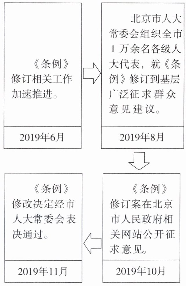 材料一 2019 年 11 月,北京市十五届人大常委会第十六次会议表决通过了关于修改《北京市生活垃圾管理条例》(以下简称《条例》)的决定。下图是《条例》修订的部分过程。