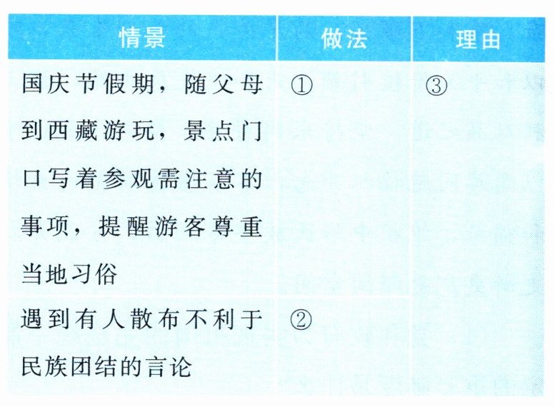 (1)中国共产党的正确领导;实行民族区域自治制度;坚持民族平等、民族团结和各民族共同繁荣的方针;实行改革开放的政策;民族地区各族人民发扬自力更生、艰苦奋斗的精神;全国人民的大力支持;等等。(2)西藏特产:青稞酒、藏红花等。自然或人文景观:布达拉宫、纳木措湖、雅鲁藏布大峡谷等。进藏铁路:青藏铁路。(3)①认真阅读注意事项,尊重当地习俗。②在确保自身安全的前提下上前制止,并及时向有关部门举报。③维护民族团结是每个公民应尽的义务。