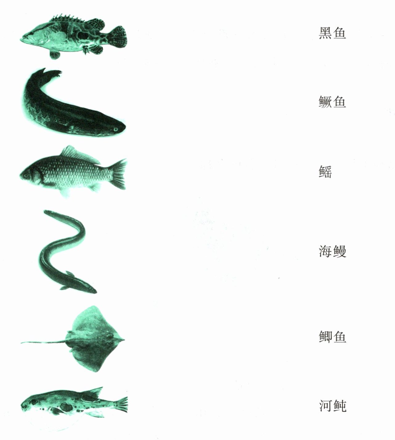 自上而下依次对应黑鱼、鳜鱼、鲫鱼、海鳗、魟鱼、河鲀(以图片顺序对应名称顺序)