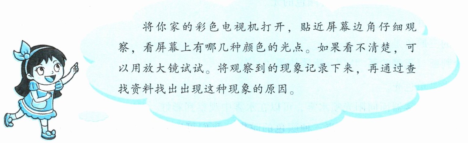 将你家的彩色电视机打开,贴近屏幕边角仔细观察,看屏幕上有哪几种颜色的光点。如果看不清楚,可以用放大镜试试。将观察到的现象记录下来,再通过查找资料找出出现这种现象的原因。