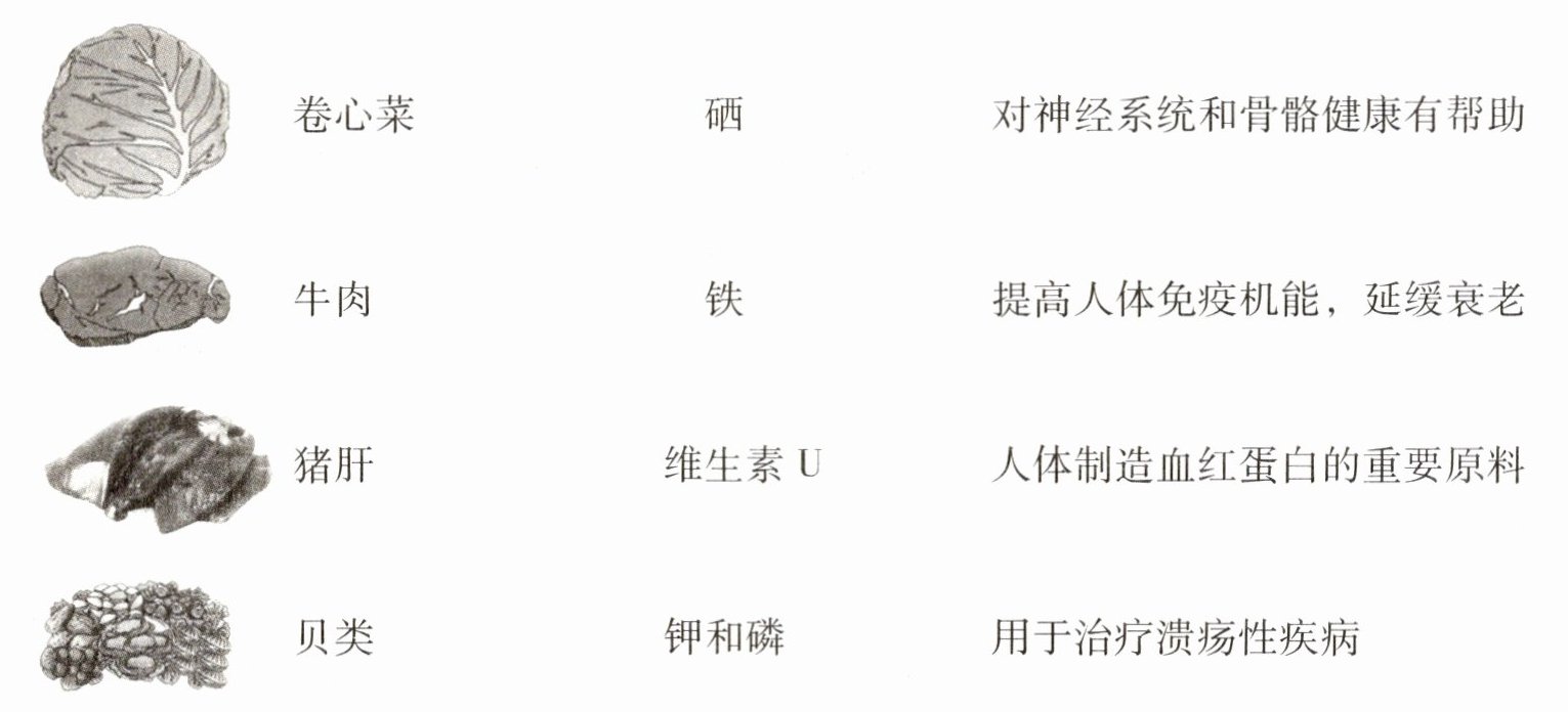 卷心菜—维生素U—用于治疗溃疡性疾病;牛肉—铁—人体制造血红蛋白的重要原料;猪肝—硒—提高人体免疫机能,延缓衰老;贝类—钾和磷—对神经系统和骨骼健康有帮助