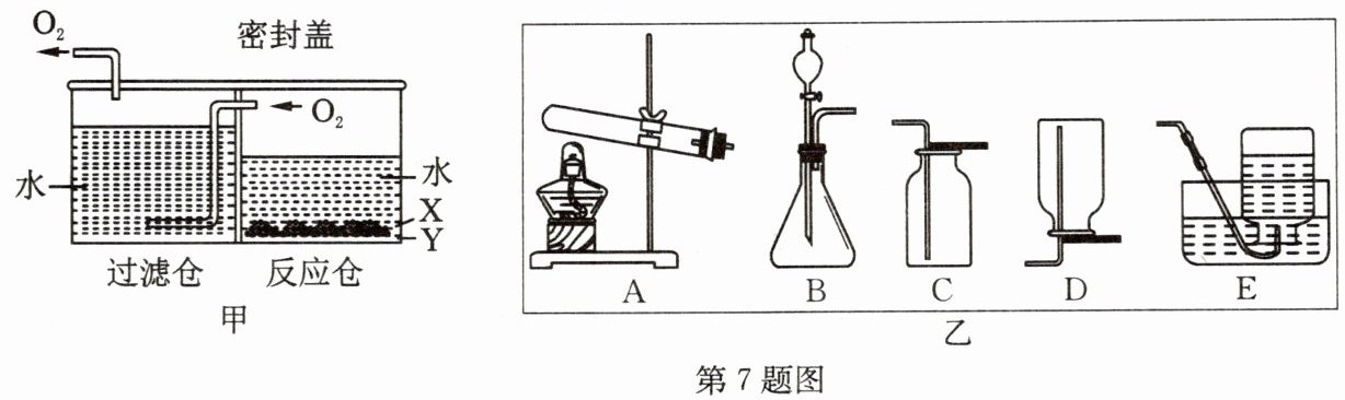7. 某兴趣小组在跨学科实践课上制作了一台简易化学制氧机,如图甲所示,该制氧机通过 X、Y 两种物质产生氧气,其中 X 是过碳酸钠(2Na₂CO₃·3H₂O₂)白色固体,Y 是二氧化锰黑色粉末。过碳酸钠加水溶解会分解生成 Na₂CO₃和 H₂O₂。