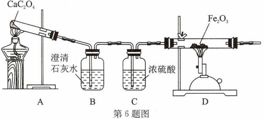 6. 已知草酸钙($ {CaC_{2}O_{4}} $)加热易分解:$ {CaC_{2}O_{4}\xlongequal{\triangle}CaO + CO↑ + CO_{2}↑} $。为验证分解产物中既有 $ {CO} $ 又有 $ {CO_{2}} $,小明设计如下实验装置,请回答下列问题(浓硫酸可干燥 $ {CO} $)。