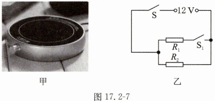 13. 如图17.2 - 7甲所示是一种电加热杯垫,可以用来随时加热水、咖啡、茶饮等,其内部简化电路图如图17.2 - 7乙所示。电路中电源电压保持12V不变,定值电阻$R_{1}$的阻值为8Ω,定值电阻$R_{2}$的阻值为12Ω。求: