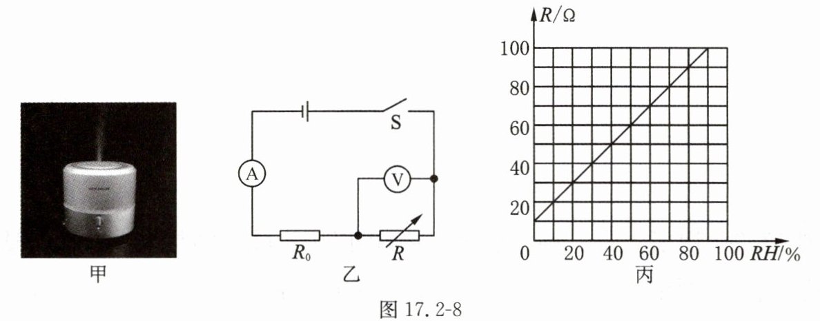 14. 如图17.2 - 8甲所示为一个超声波加湿器,如图17.2 - 8乙所示为其内部湿度监测装置的简化电路图。已知电源电压为12V,定值电阻$R_{0}$的阻值为20Ω,湿敏电阻$R$的阻值随相对湿度$RH$变化的关系图像如图17.2 - 8丙所示。