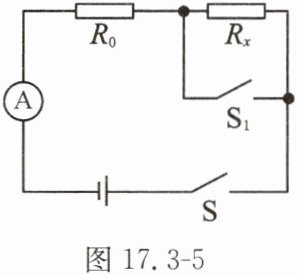 (5) 在没有电压表的情况下,小明又设计了如图 17.3 - 5 所示的电路测量待测电阻器的电阻 $ R_x $,定值电阻的电阻为 $ R_0 $,实验步骤如下: