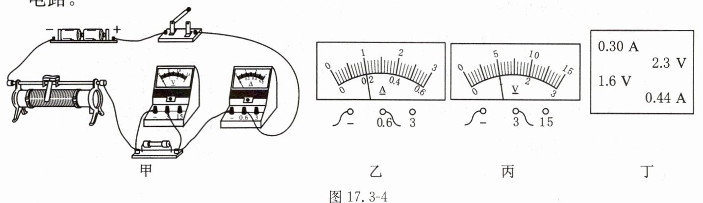 。(3) 排出故障,闭合开关,两个电表的示数如图 17.3 - 4 乙、丙所示,小丽将该组数据作为表中序号 1 的实验数据。她继续实验,将测得的另两组实验数据随手记录在图 17.3 - 4 丁所示的草稿纸上,请将她记录的数据整理后填写在表中,作为序号 2、3 实验数据,并说明这样填写的理由: