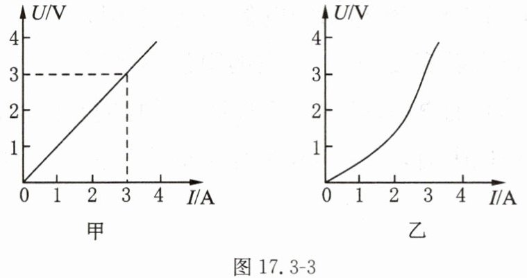 5. 在“用电流表和电压表测量电阻”的实验中,有两位同学分别选择将定值电阻和小灯泡作为测量对象,在处理实验数据时,分别画出了它们的 $ U - I $ 图像,如图 17.3 - 3 甲、乙所示,对于图像的分析,以下说法错误的是(