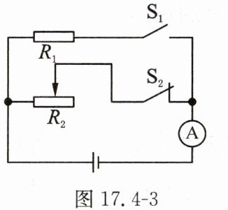5. 如图 17.4 - 3 所示,若电阻器 $R_1$ 与滑动变阻器 $R_2$ 此时接入电路中的电阻相同,开关 $S_1$ 断开,开关 $S_2$ 闭合,则下列操作中,一定可以使电流表的示数变大的是(