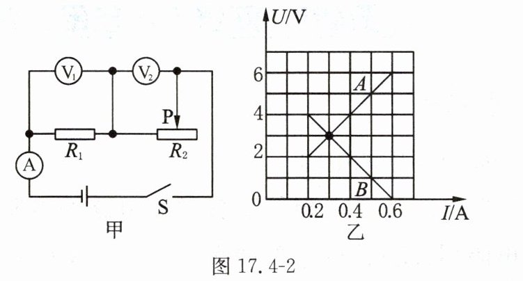4. 如图 17.4 - 2 甲所示,电源电压保持不变,闭合开关 $S$,调节滑动变阻器的滑片,两个电压表的示数随电路中电流的变化的图像如图 17.4 - 2 乙所示。此时电阻器 $R_1$ 和 $R_2$ 是