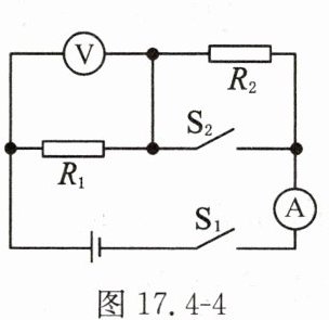 6. 如图 17.4 - 4 所示,电源电压保持不变,闭合开关 $S_1$、$S_2$,电压表的示数为 $6$ V,电流表的示数为 $0.6$ A,断开开关 $S_2$ 后,电压表示数变为 $2$ V,则 $R_2$ 的电阻和电源电压分别是(