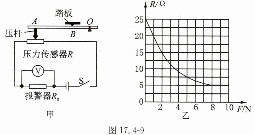11. 小丽设计了一个防踩踏模拟报警装置,其工作原理的简化电路如图 17.4 - 9 甲所示。$ABO$ 为一水平杠杆,$O$ 为支点,$OA : OB = 5 : 1$,当水平踏板所受压力增大,电压表的示数达到 $6$ V 时,报警器开始发出报警信号。已知电源电压为 $8$ V,报警器的电阻 $R_0$ 恒为 $15$ Ω,压力传感器固定放置,其电阻 $R$ 随所受压力 $F$ 变化的关系图像如图 17.4 - 9 乙所示,踏板、压杆和杠杆的质量均忽略不计。则:
