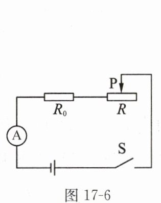 8. 如图 17 - 6 所示,一个定值电阻的电阻为 $ R_0 $,将它与最大电阻为 40 $\Omega$ 的滑动变阻器串联在电路中,闭合开关 S,当滑动变阻器的滑片 P 滑到最左端时,电流表的示数为 0.3 A;当滑动变阻器的滑片 P 滑到最右端时,电流表的示数为 0.1 A。则定值电阻的电阻 $ R_0 = $