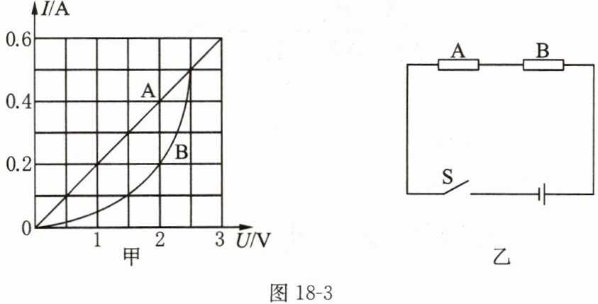 4. 有两个电路元件 $ A $ 和 $ B $,流过元件的电流与其两端电压的关系如图 18 - 3 甲所示,把它们串联在电路中,如图 18 - 3 乙所示。闭合开关 $ S $,这时电路中的电流为 $ 0.2A $,则电源电压和元件 $ B $ 的电功率分别是(