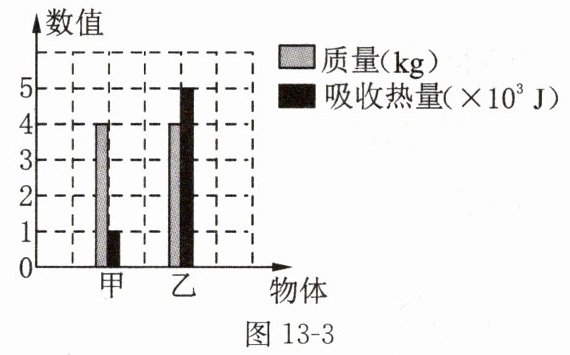 6. 现有甲、乙两个物体,测得它们在一定质量下,温度升高$1^{\circ}C$时吸收的热量,根据测得的数据绘制成如图 13 - 3 所示的直方图,则(
