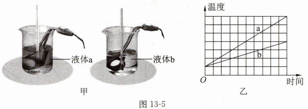 10. 如图 13 - 5 甲所示,利用相同规格的加热器加热质量相同的 a、b 两种液体,得到温度随时间变化的图像如图 13 - 5 乙所示,分析可知(