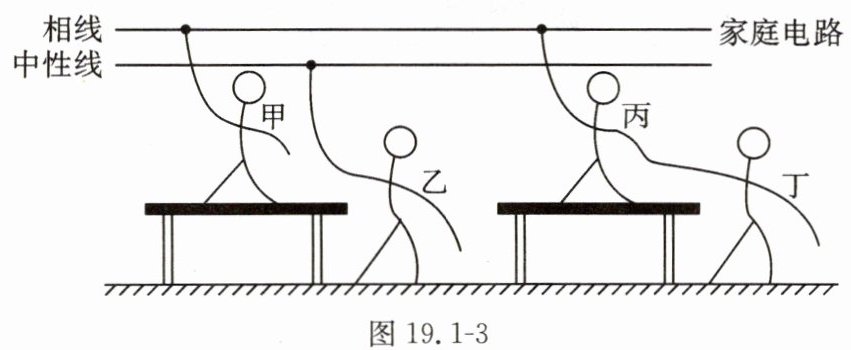 9. 如图19.1-3所示,甲站在干燥的木桌上一只手接触到相线;乙站在地上一只手接触到中性线;丙站在干燥的木桌上一只手接触到相线;此时,丁站在地面上用手去拉丙,则(