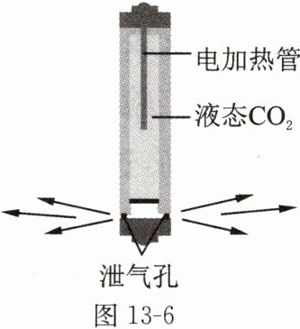 11. 二氧化碳$(CO_{2})$爆破技术是现代工程建设中非常环保的技术。起爆前高压泵将$CO_{2}$压缩成高压气体,液化后输入爆破筒内。如图 13 - 6 所示,爆破时电加热管发热,使筒内的液态$CO_{2}$迅速汽化,形成的高压气体从泄气孔中喷出,实施爆破。下列说法正确的是(