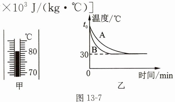 12. 为比较 A、B 两个保温杯的保温性能,小红在两个保温杯中分别倒入$0.1kg$相同温度的热水,用温度计测量其初温$t_{0}$,温度计示数如图 13 - 7 甲所示,$t_{0}=$