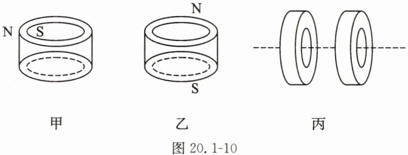 在确认该磁体有磁性后,为了解该磁体的磁极分布,他猜想:①可能呈横向分布(如图20.1 - 10甲所示),外侧为N极,内侧为S极;②可能呈纵向分布(如图20.1 - 10乙所示),上端为N极,下端为S极。于是他将两个大小相同的环形磁体沿中心轴线相互靠近(如图20.1 - 10丙所示),发现它们相互排斥。再将其中一个环形磁体翻转180°,若它们相互
