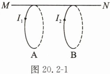 3. 小明在课下通过查阅资料,知道通电线圈相当于一匝通电螺线管,其两侧的磁极与线圈中电流方向的关系也符合安培定则——用右手握住线圈,让四指指向线圈中电流的方向,则大拇指所指的那端就是线圈的N极。请你猜想,如图20.2 - 1所示,把两个线圈A和B挂在水平光滑的固定细杆MN上,且平行靠近放置,当线圈通入如图的方向相反的电流时,线圈A和B将互相