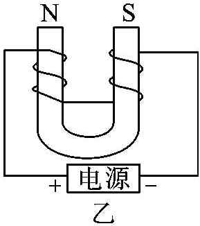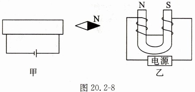 11. 在图20.2 - 8中,静止的小磁针右端是N极,请画出甲图中通电螺旋管导线的绕法;根据乙图通电螺线管的极性,判断电源的正、负极。