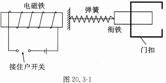 1. 如图 20.3 - 1 所示是一种单元防盗门门锁的工作原理图,它的工作过程是当有人在楼下按门铃时,楼上的人闭合开关,门锁上的电磁铁通电