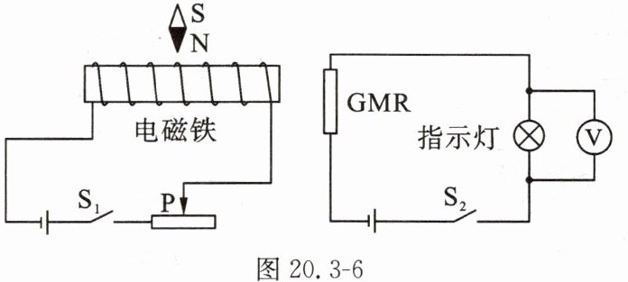 7. 如图 20.3 - 6 所示,GMR 是一个巨磁电阻,其阻值随磁场的增强而急剧减小,当闭合开关$S_{1}$、$S_{2}$时,下列说法正确的是(