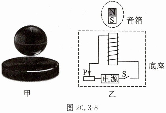 9. 如图 20.3 - 8 甲所示为某款磁悬浮音箱,可通过调节底座上的旋钮来调节音箱悬浮的高度。经了解,磁悬浮音箱的内部简化电路图如图 20.3 - 8 乙所示:音箱底部有一块磁体,底座内部有一个电磁铁。则(
