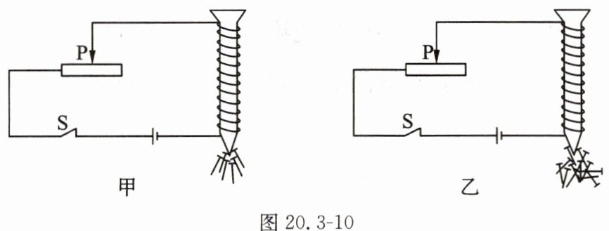 11. 为探究“影响电磁铁磁性强弱的因素”,小明用电池(电压一定)、滑动变阻器、大头针、铁钉以及导线为主要器材,进行如图 20.3 - 10 所示的简易实验。