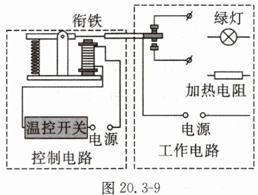 10. 某同学设计的冬季家庭温度自动控制器的工作原理简化示意图如图 20.3 - 9 所示。当室内温度低于$25^{\circ}C$时温控开关闭合,绿灯不亮,加热电阻工作,温控开关断开,绿灯亮,表示温度已经达到$25^{\circ}C$。请根据以上要求,用笔画线表示导线,将电路连接完整。